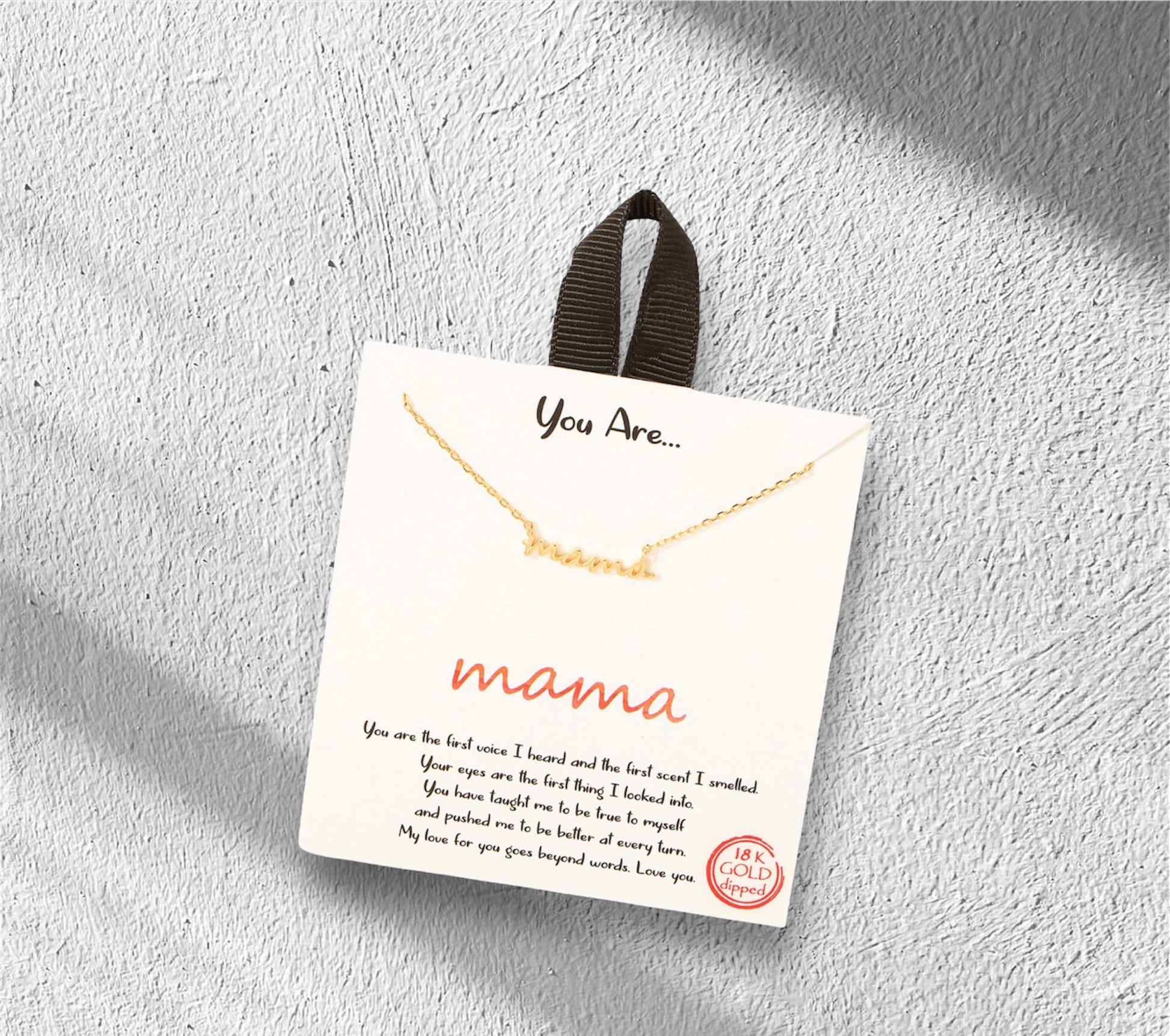 La cita del colgante dice: "Eres la primera voz que escuché y el primer aroma que olí. Eres lo primero que miré. Me enseñaste a ser fiel a mí mismo y me empujaste a ser mejor en todo momento. Mi amor por ti va más allá de las palabras. Te amo".