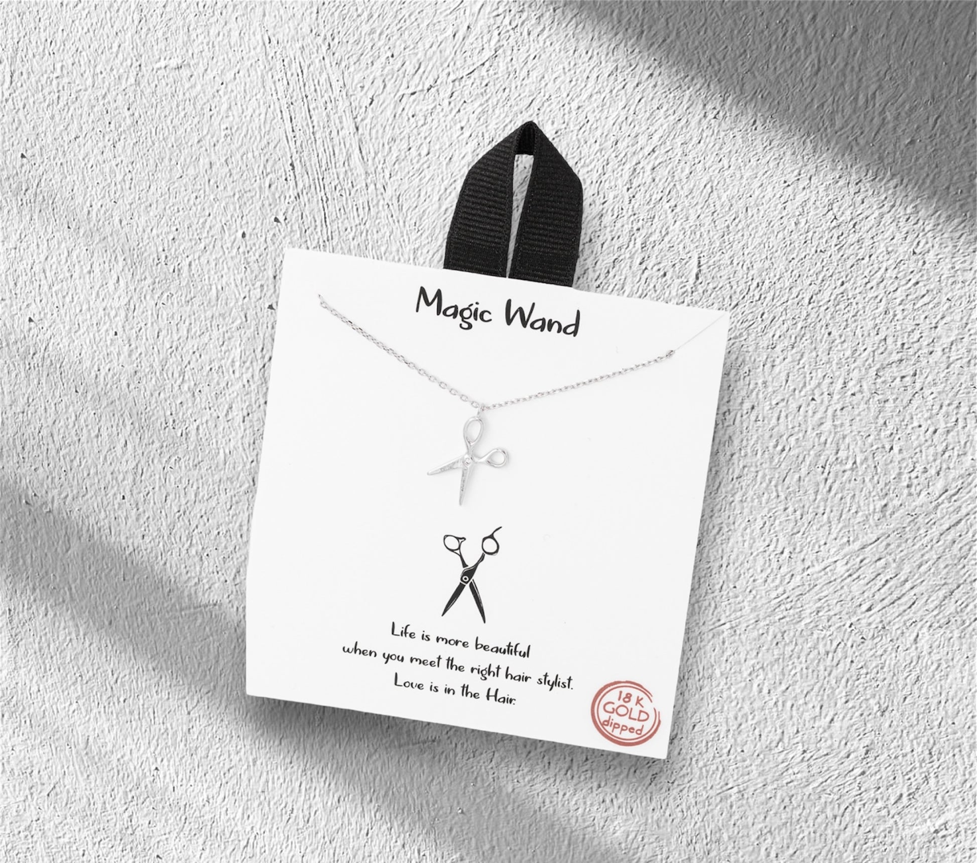 La cita del colgante dice: “La vida es más hermosa cuando conoces al peluquero adecuado. El amor está en el cabello”.